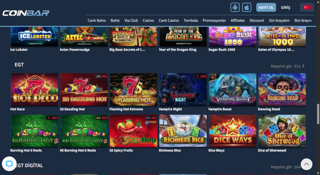 Canlı casino, slot oyunları, masa oyunları ve daha fazlası Coinbar’da sizleri bekliyor. Özellikle Evolution Gaming, Pragmatic Play gibi dünyaca ünlü sağlayıcılar ile kaliteli bir oyun deneyimi yaşayabilirsiniz.